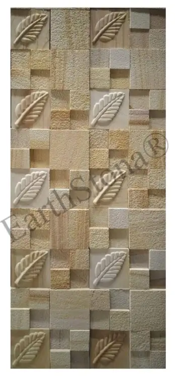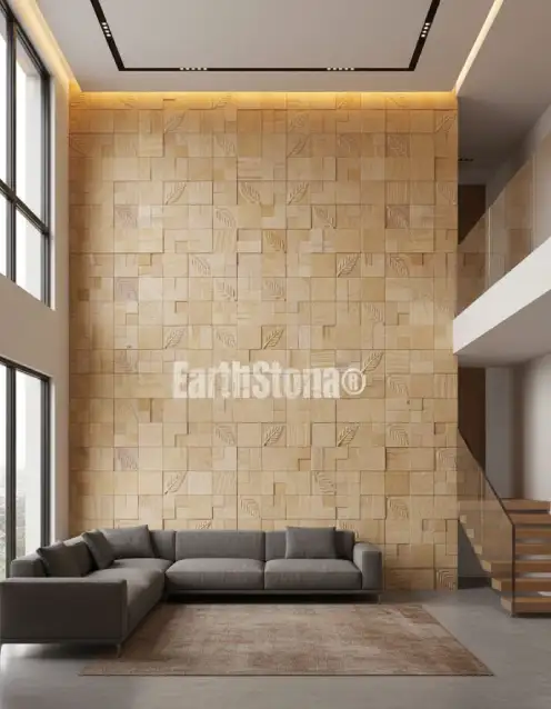 Modern Leaf Carving Sandstone Wall Cladding for Double Height Walls by EarthStona is a premium natural stone wall design created to enhance luxury interiors and elegant villa elevations. This designer sandstone wall cladding features a beautiful combination of geometric stone blocks with artistic leaf carving motifs, giving the wall a rich natural texture and sophisticated architectural appearance. The warm earthy tones and natural grains of sandstone make this wall cladding a perfect choice for creating stylish feature walls in modern homes, luxury villas, hotels, and commercial spaces.