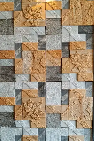 Leaf carving sandstone wall cladding is a decorative natural stone wall panel featuring artistic leaf motifs carved into sandstone blocks. It is used to create elegant feature walls in luxury homes, villas, hotels, and commercial interiors.