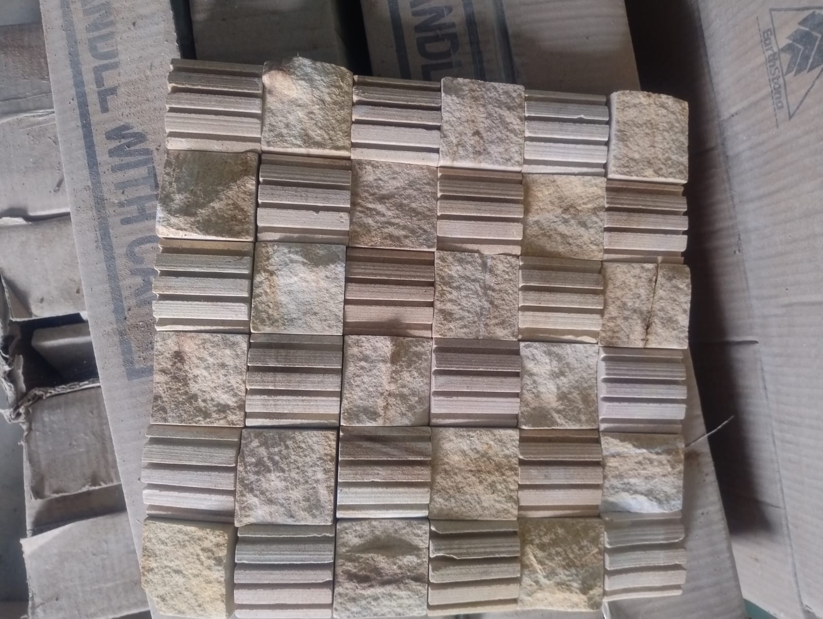 Transform your space with the beauty of natural stone with our Yellow Groove Cut Mosaic Stone Cladding tiles.